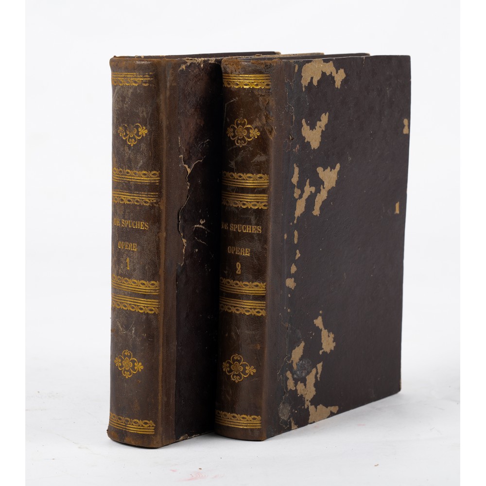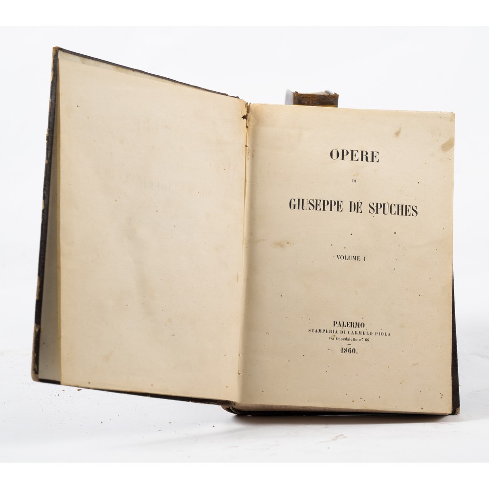 DUE VOLUMI di Giuseppe de Spuches OPERE DI GIUSEPPE DE SPUCHES, ed. Palermo, Carmelo Piola 1860. In 2 volumi in 8°. Legature coeve in mezza pelle con titoli, filetti e fregi in oro ai dorsi e piatti cartonati impressi a secco con motivi floreali. Tagli incisi. Usure d’uso ai piatti e piccoli segni di gore al dorso, ma volumi in ottime condizioni. con pagine pulite e perfettamente conservate. Pp. VI, 478; 411, (4).