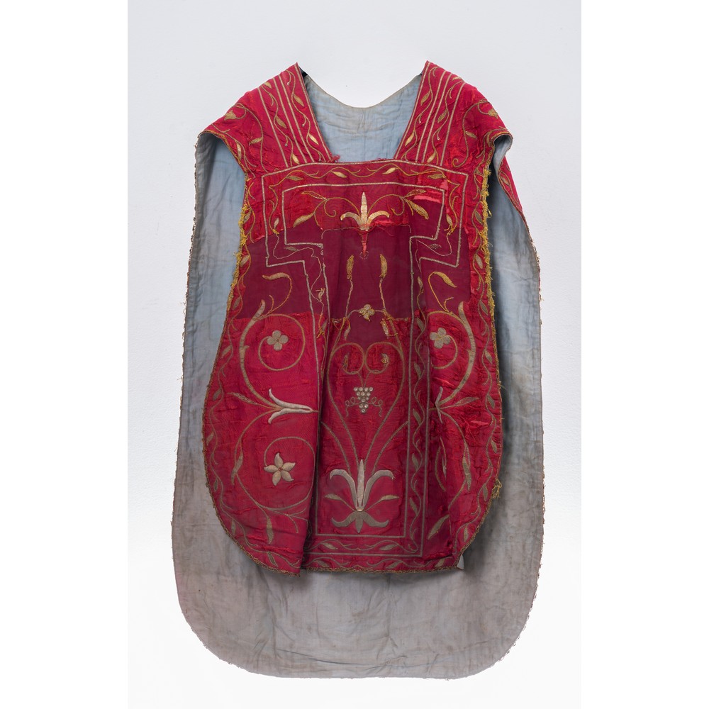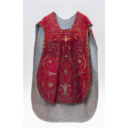 Pianeta nei toni del rosso cardinalizio riccamente lavorata a fili dorati (usure e restauri).
