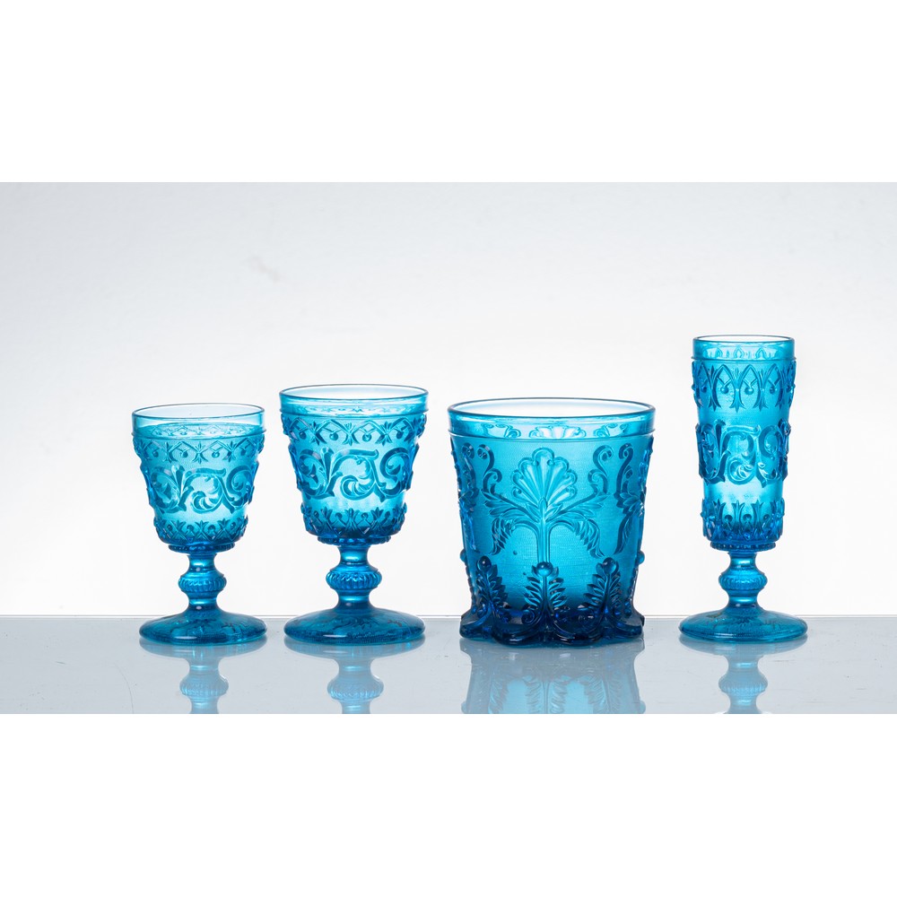 Servizio di bicchieri Liberty in vetro nei toni del blu composto da portaghiaccio, 30 bicchieri vino, 29 bicchieri acqua e 30 flutes.