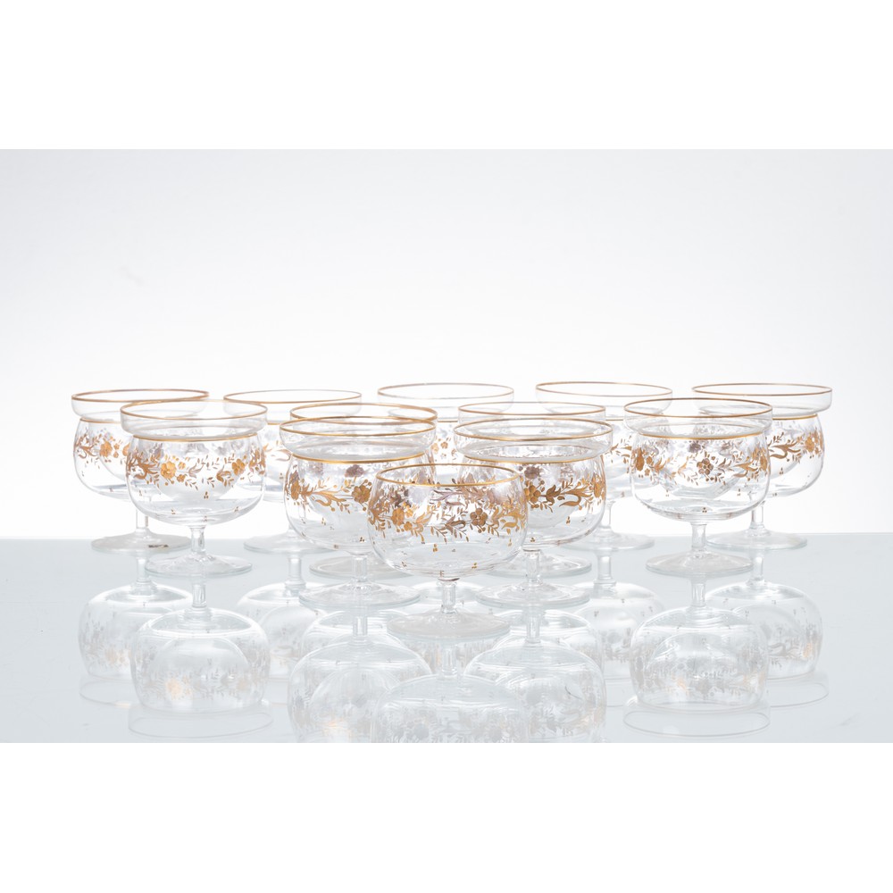 Dodici coppe da caviale in vetro con decori in oro a motivo floreale (una coppetta interna mancante).