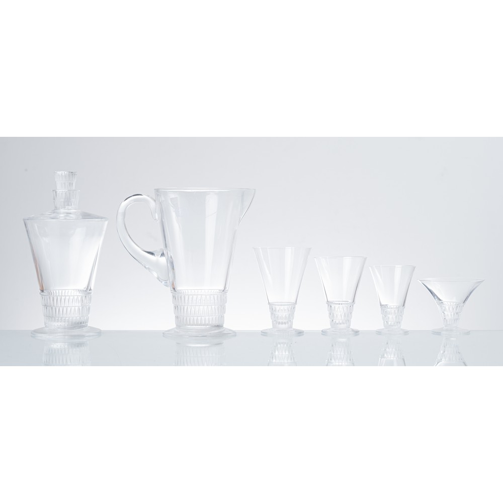 Servizio di bicchieri in cristallo "Borgueil" composto da: 11 bicchieri acqua, 12 bicchieri vino, 12 bicchieri liquore, 12 coppe, bottiglia e brocca.
