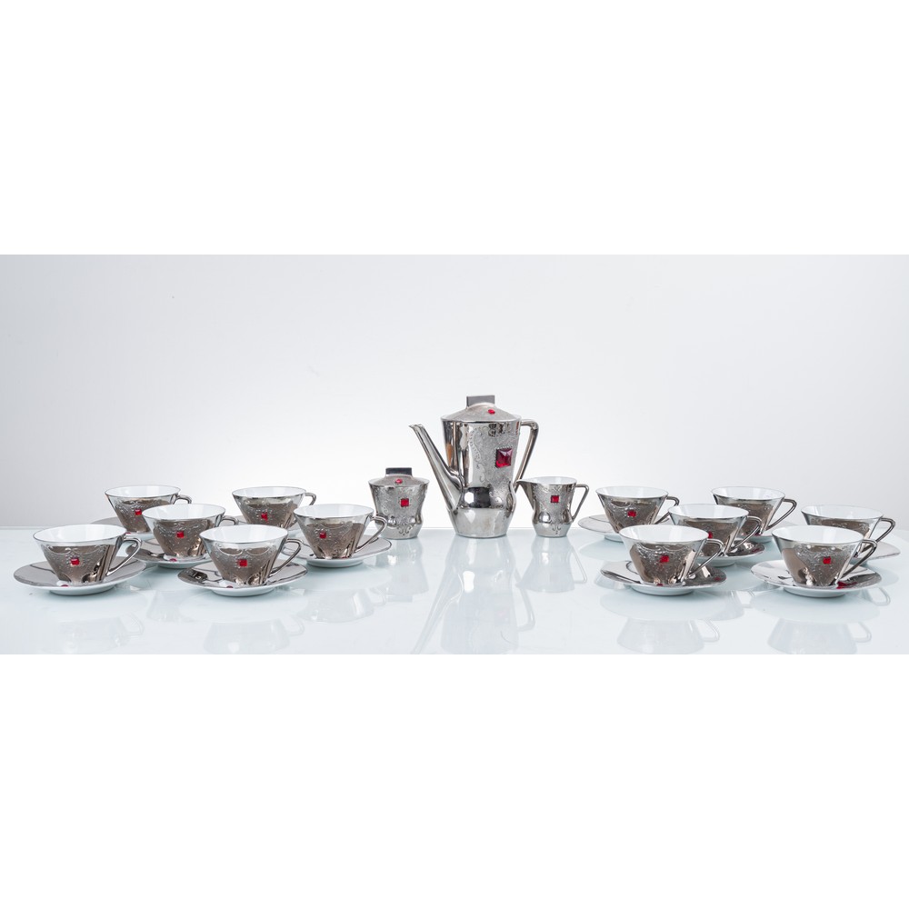 Servizio da tè in porcellana laminata e lavorata nei toni dell'argento con pietre nei toni del rossi composto da: teiera, lattiera, zuccheriera e 12 tazze con piattini.