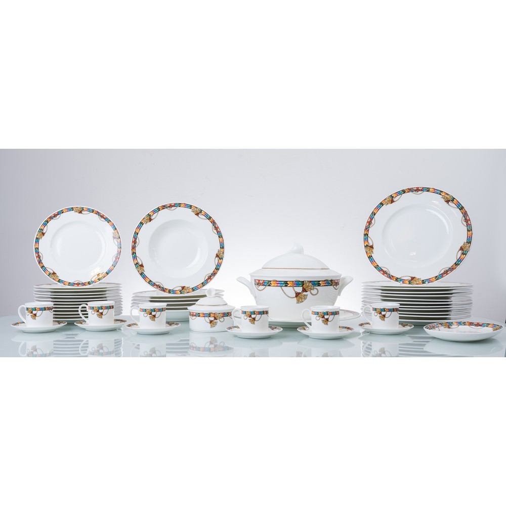 Servizio di piatti in porcellana composto da piatto da portata, zuppiera, raviera, 12 piatti piani, 6 piatti fondi, 12 piatti frutta, zuccheriera e 6 tazzine con piattino.