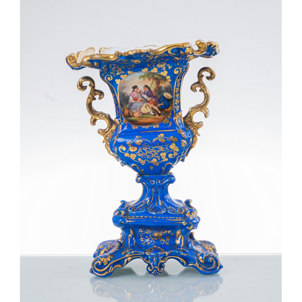Vaso Luigi Filippo in porcellana Vecchia Parigi decorata e dipinta nei toni del blu, medaglione centrale raffigurante "Scena galante" (usure e restauri).