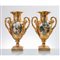 Coppia di vasi stile Impero in porcellana decorata e dipinta, lumeggiati in oro, medaglioni centrali raffiguranti "Scene bucoliche".