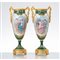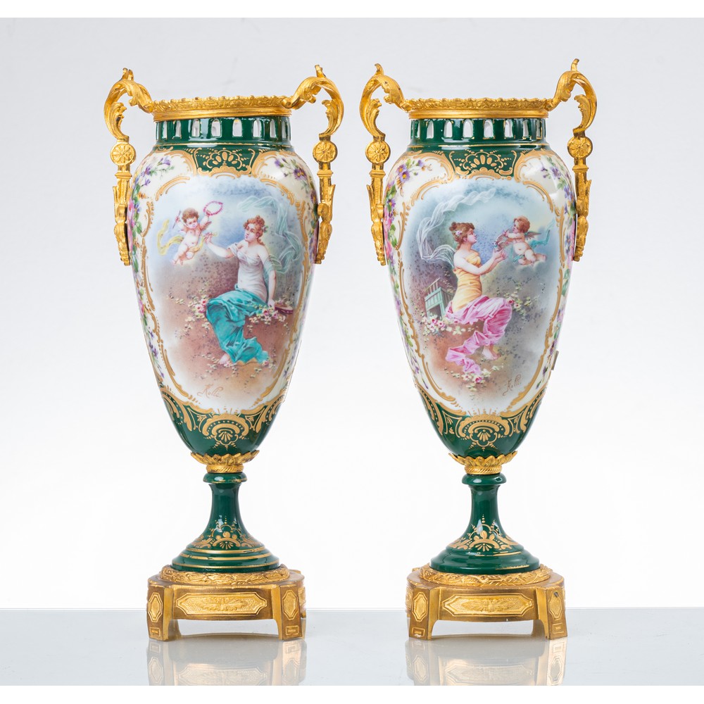 Coppia di vasi in porcellana di Sevres dipinta e decorata a mano, basi ed anse in bronzo dorato.