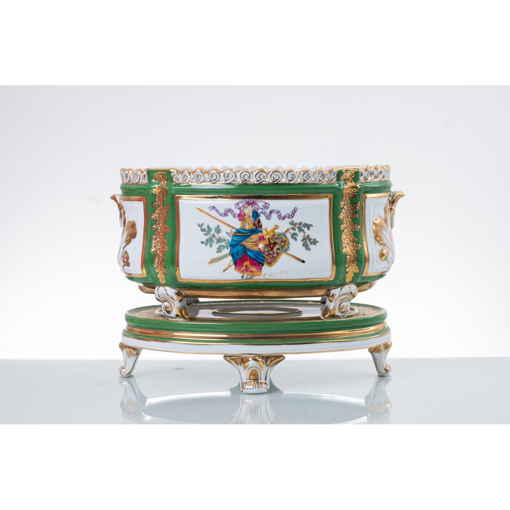 Fioriera con base in porcellana decorata raffigurante "Scene mitologiche", lumeggiature in oro.