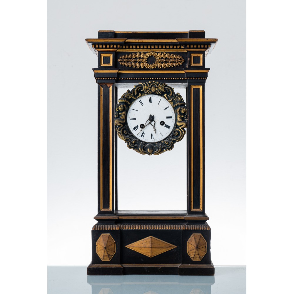 Orologio a tempietto in legno ebanizzato, piccole cornici dorate, quadrante smaltato a numeri romani.