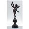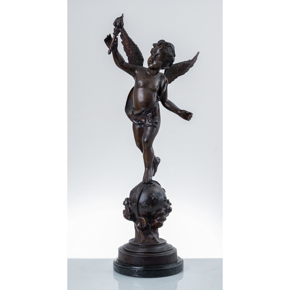 Scultura in bronzo raffigurante "Putto alato con fiaccola", fusione a cera persa, base in marmo nero.