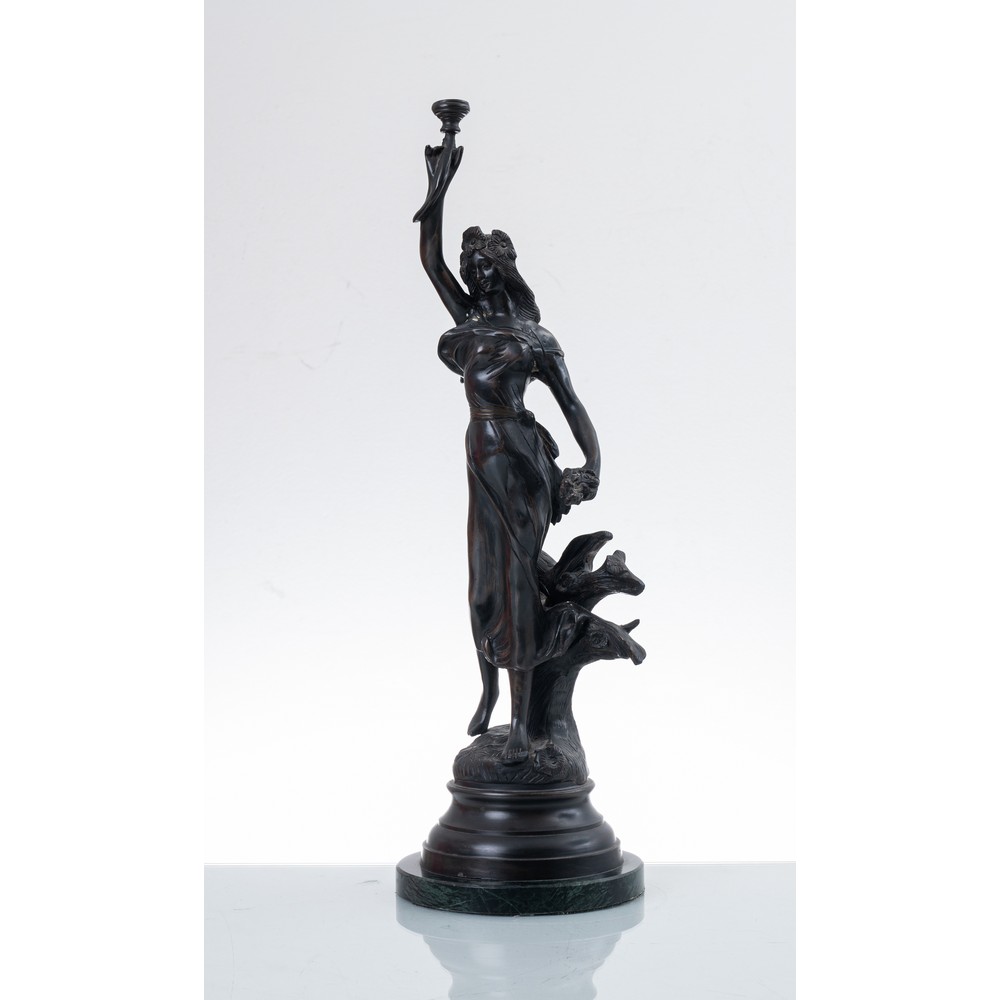 Scultura in bronzo raffigurante "Figura femminile con torcia", fusione a cera persa, base in marmo verde delle Alpi, stile Liberty.