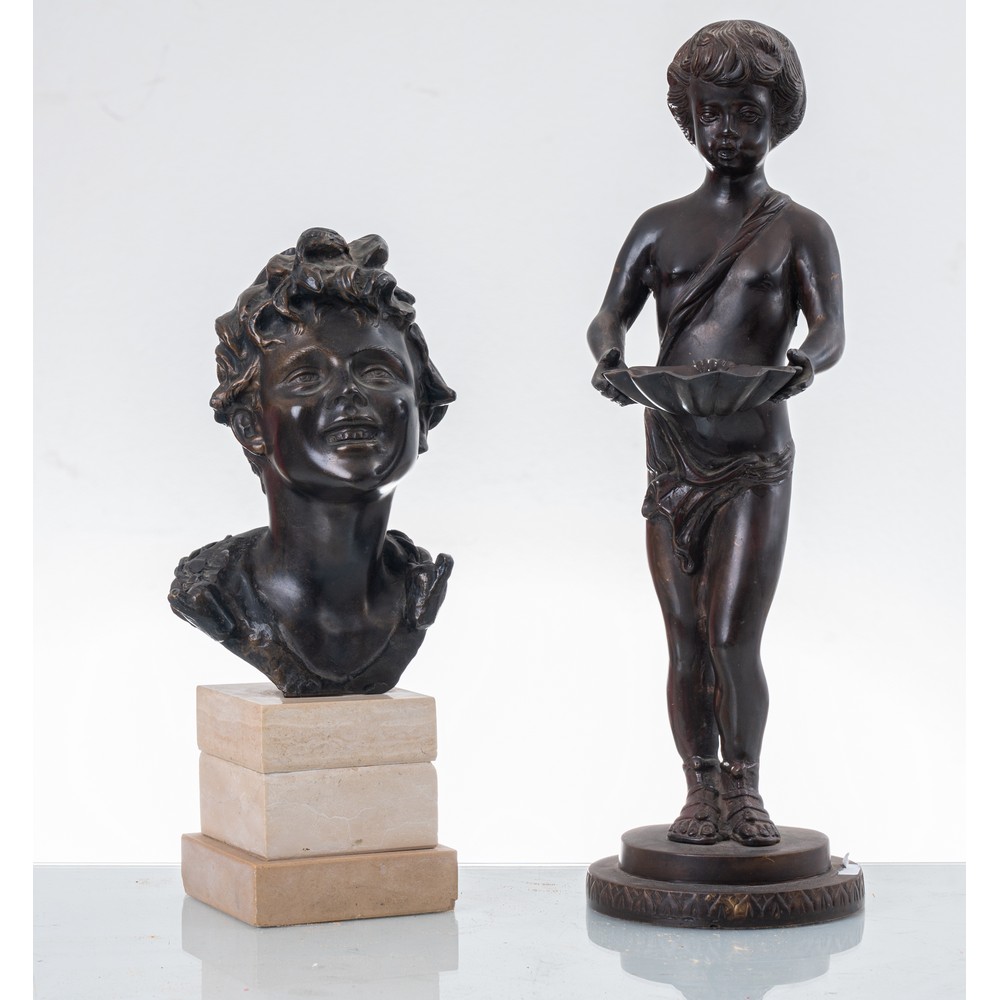 Scultura in bronzo raffigurante "Volto di fanciullo", fusione a cera persa, firma nel retro De Martino e scultura in bronzo raffigurante "Fanciullo con conchiglia", fusione a cera persa.