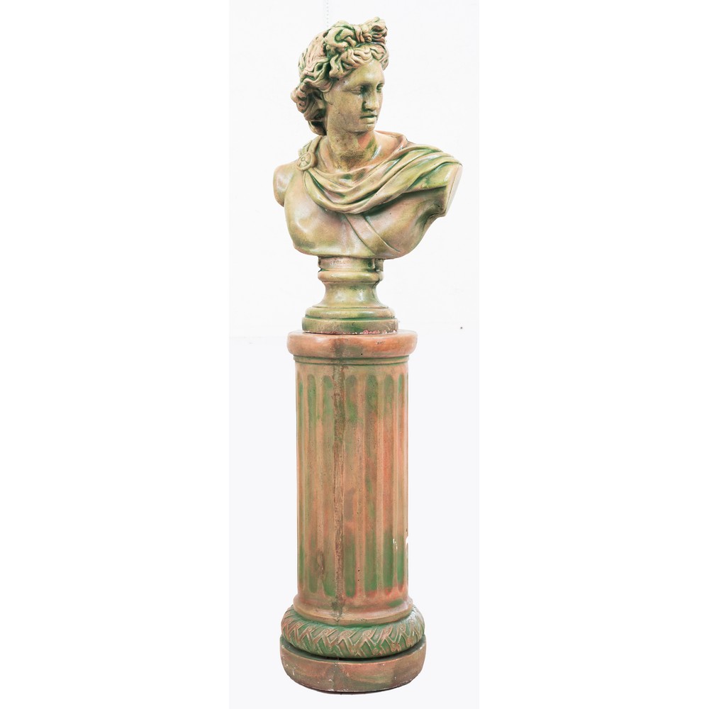 Scultura in terracotta smaltata con colonna raffigurante "Busto di Apollo"