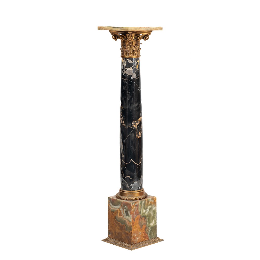 Colonna in marmo nero venato con piano in onice, capitello e base in bronzo dorato.