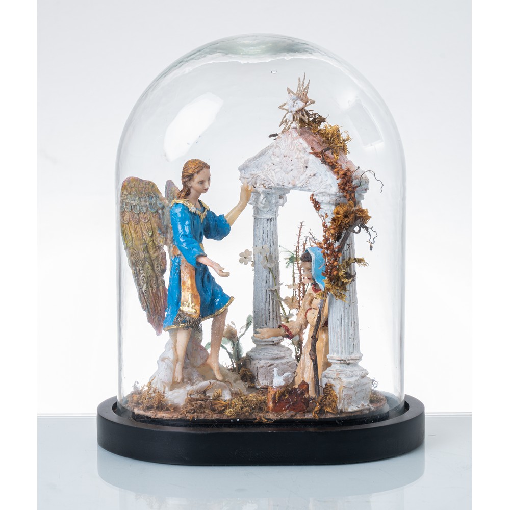 Composizione in ceroplastica raffigurante "L'Annunciazione" entro campana in vetro.