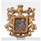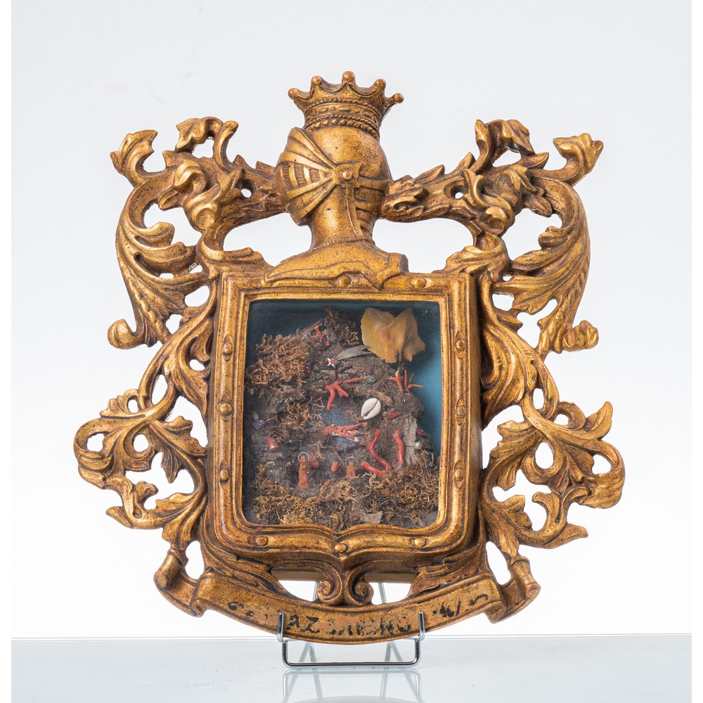 Composizione in corallo e cera raffigurante "Presepe", entro teca con cornice in legno dorato e intagliato, con stemma nobiliare.