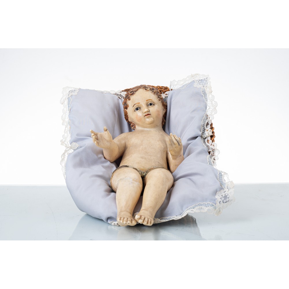 Scultura in ceroplastica raffigurante "Bambinello disteso" con occhi in vetro.