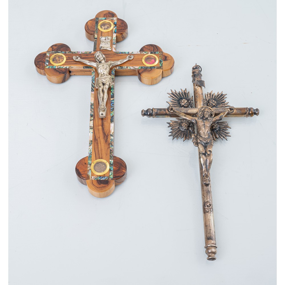 Crocifisso in argento e crocifisso in metallo argentato con croce in radica di ulivo e riquadrature in madreperla (usure).