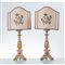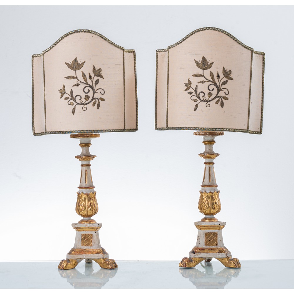 Coppia di candelieri in legno laccato e dorato con ventole in seta ricamata (elettrificati).