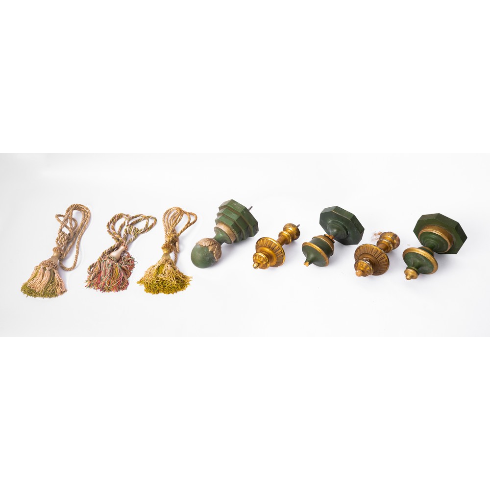 Cinque reggi embrasse in legno laccato e dorato e tre cordini in tessuto.