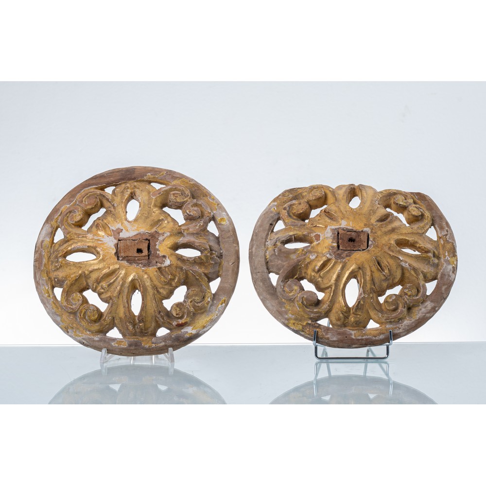 Coppia di fregi di forma rotonda in legno dorato ad oro zecchino (usure e mancanze).