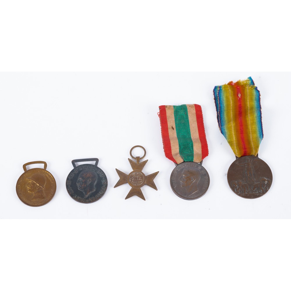 CINQUE MEDAGLIE COMMEMORATIVE E AL MERITO: 1) MEDAGLIA VITTORIO EMANUELE III 1915-1918 - GUERRA PER L'UNITÀ D'ITALIA. Medaglia commemorativa in bronzo della guerra 1915-1918 per il compimento dell’Unità d’Italia. Al diritto, nel campo, busto di Vittorio Emanuele III in divisa militare ed elmetto, volto a destra. All'intorno la scritta «GUERRA PER L'UNITA' D'ITALIA 1915-1918».2) MEDAGLIA COMMEMORATIVA DELL’UNITÀ D’ITALIA 1848-1918. In bronzo. Terminata la Prima guerra mondiale Vittorio Emanuele III considerò compiuta la riunificazione della penisola sotto il Regno d’Italia e decise di “rifondare” la medaglia. Che venne concessa a tutti i combattenti della Grande Guerra.3) MEDAGLIA AFRICA ORIENTALE VITTORIO EMANUELE III IMPERATORE D’ETIOPIA. La medaglia in bronzo commemorativa delle operazioni militari in Africa Orientale, istituita con regio decreto 27 aprile 1936, fu una medaglia concessa dal Regno d'Italia a tutti coloro che avessero preso parte alle operazioni militari in Africa orientale compiute dall'esercito italiano tra il 1935 e il 1936.4) MEDAGLIA GRANDE GUERRA Per le Civiltà 1914 - 1918. Medaglia commemorativa per la campagna di guerra 1914-1918 ai combattenti delle nazioni alleate ed associate, detta anche “Interalleata”. Al diritto, al centro, la Vittoria alata con una fiaccola fiammeggiante nella mano destra e in basso quattro leoni tra due festoni di foglie d'alloro. Al rovescio, tripode centrale dal quale si levano in volo, da parti opposte, due colombe portanti nel becco un ramoscello d'olivo. In alto, nel giro, la dicitura «GRANDE GUERRA PER LA CIVILTA'». Ai lati del tripode in numeri romani le date: «MCMXIV», a sinistra e «MCMXVIII» a destra.5) CROCE SAVOIA PER I 25 ANNI DI SERVIZIO MILITARE. Dritto: Croce potenziata e monogramma VEIII. Rovescio: Croce potenziata e XXV.