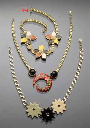 LANCETTI Collana dorata, girocollo con inserti di fiori smaltati a cinque petali di colore bianco, marrone, nero, arancio e giallo, e pistillo in strass, anni '80 Cm 43 1980's gold colored chain necklace with 3 white, brown, black, orange and yellow flower shaped medalions with rhinestones