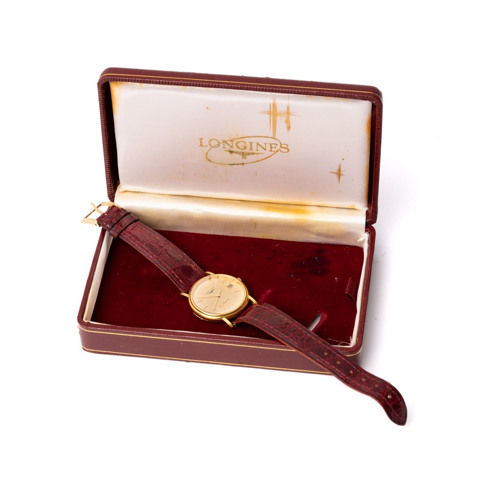 LONGINES orologio da polso, cassa in oro giallo 18 KT, movimento al quarzo, cinturino in pelle bordeaux non originale, cofanetto originale.