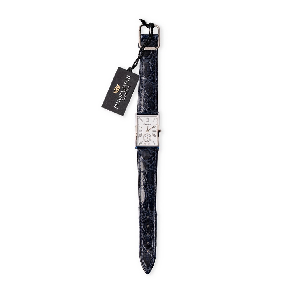 OROLOGIO PHILIP WATCH da donna con cassa in oro bianco 18 KT, sottoquadrante dei secondi, movimento al quarzo, cinturino originale in pelle blu.