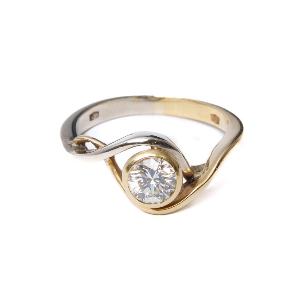 ANELLO in oro giallo e bianco 18 KT con diamante taglio brillante ct. 0,80 peso di stima J Color SI1 (g. 6,10).