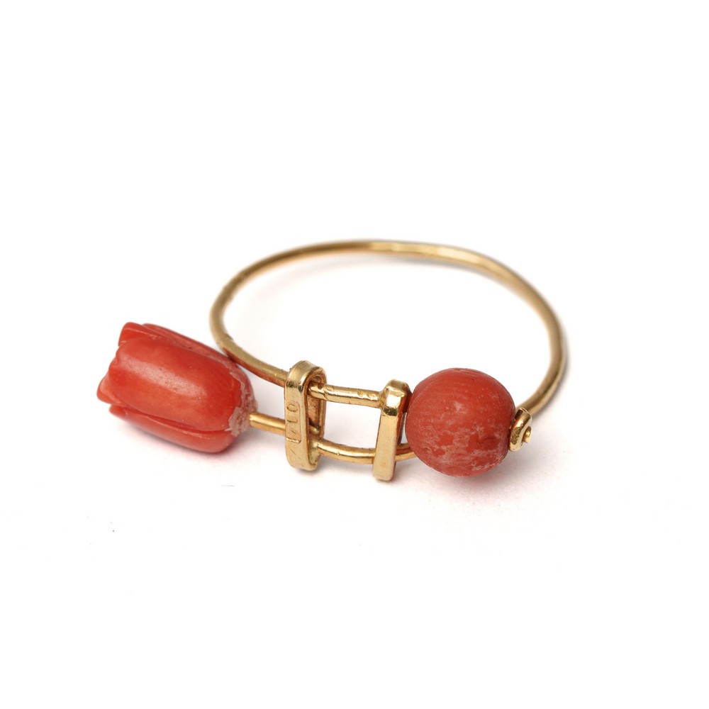 ANELLO in oro giallo 18 KT con perlina e fiore in corallo rosso (g. 1,37).
