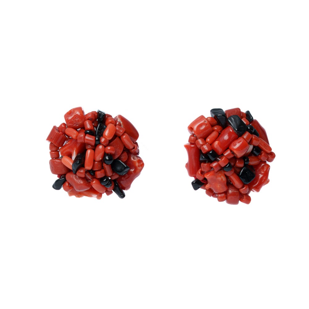 ORECCHINI in oro giallo 18 KT in corallo rosso e onice (g. 15,50).