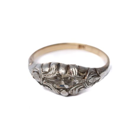 ANELLO in oro bianco e giallo 18 KT con diamante taglio antico ct. 0,20 peso di stima (g. 1,65) (usure).