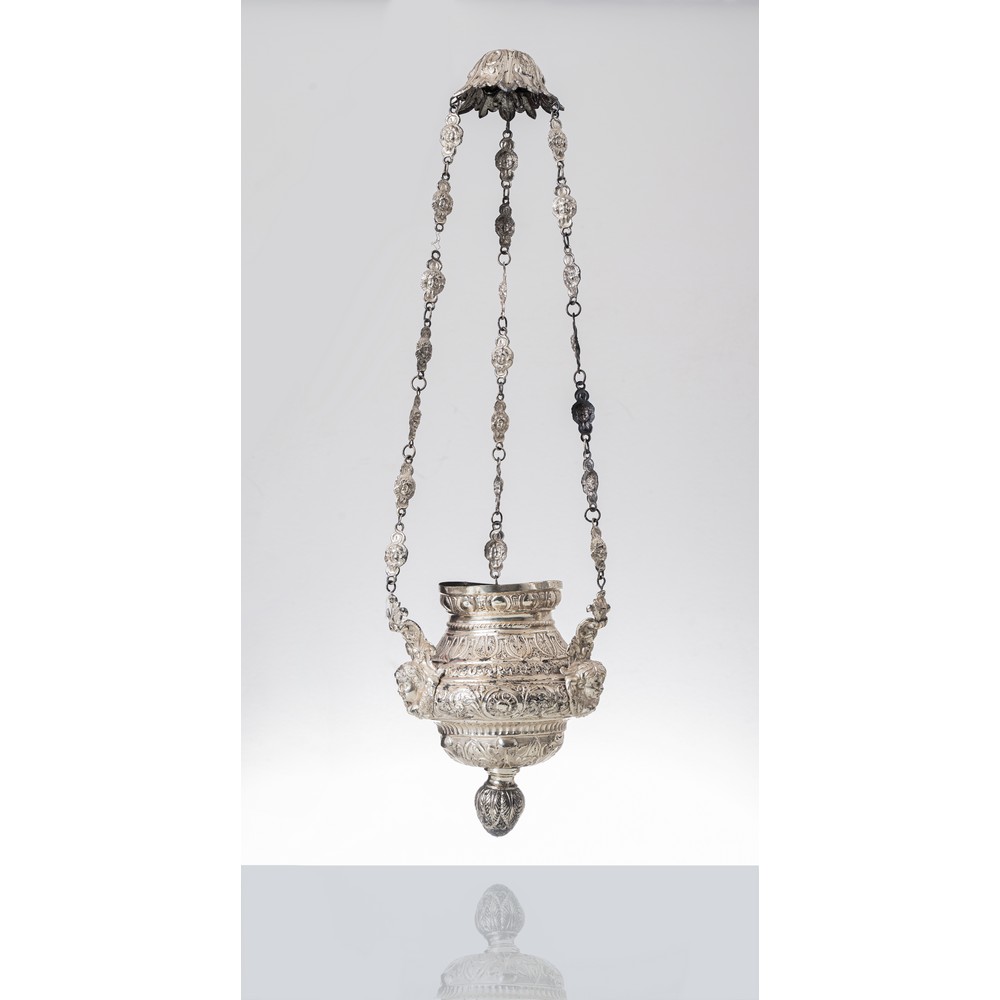 Lampada votiva in argento riccamente sbalzato a motivo fogliaceo e volti di putti. Reca punzone CA (probabilmente Cagliari).