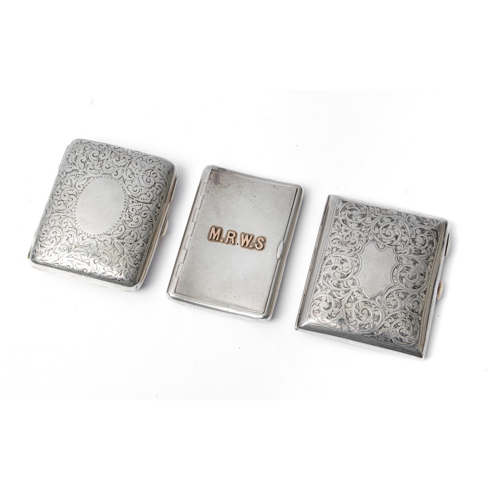 Due portasigarette in argento 925 cesellato e tabacchiera in argento 925 con applicazione "MRWS" (g. 274) (mancanza).