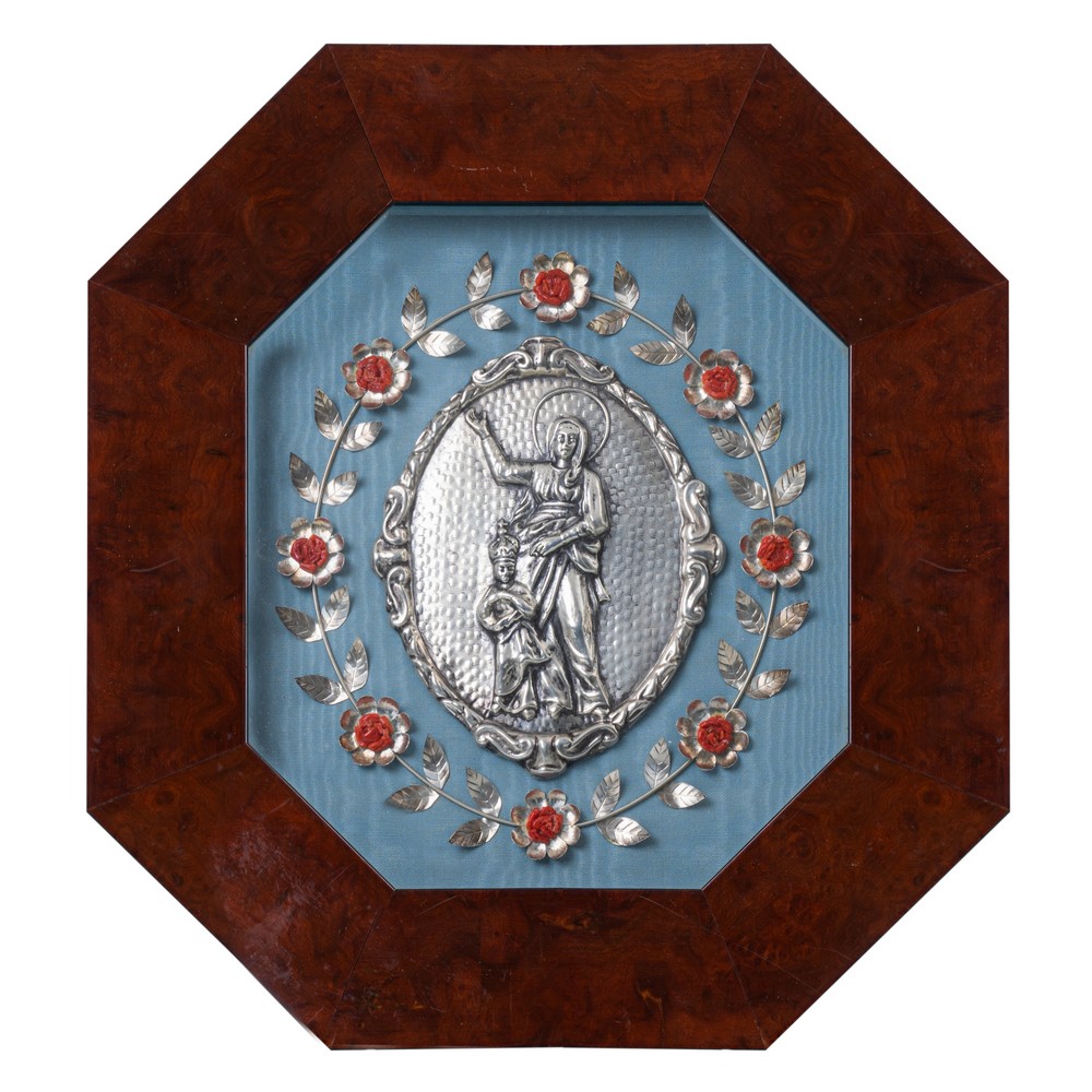 Ex voto in argento raffigurante "La Madonna con il Bambino" con decori in corallo, entro cornice in legno.