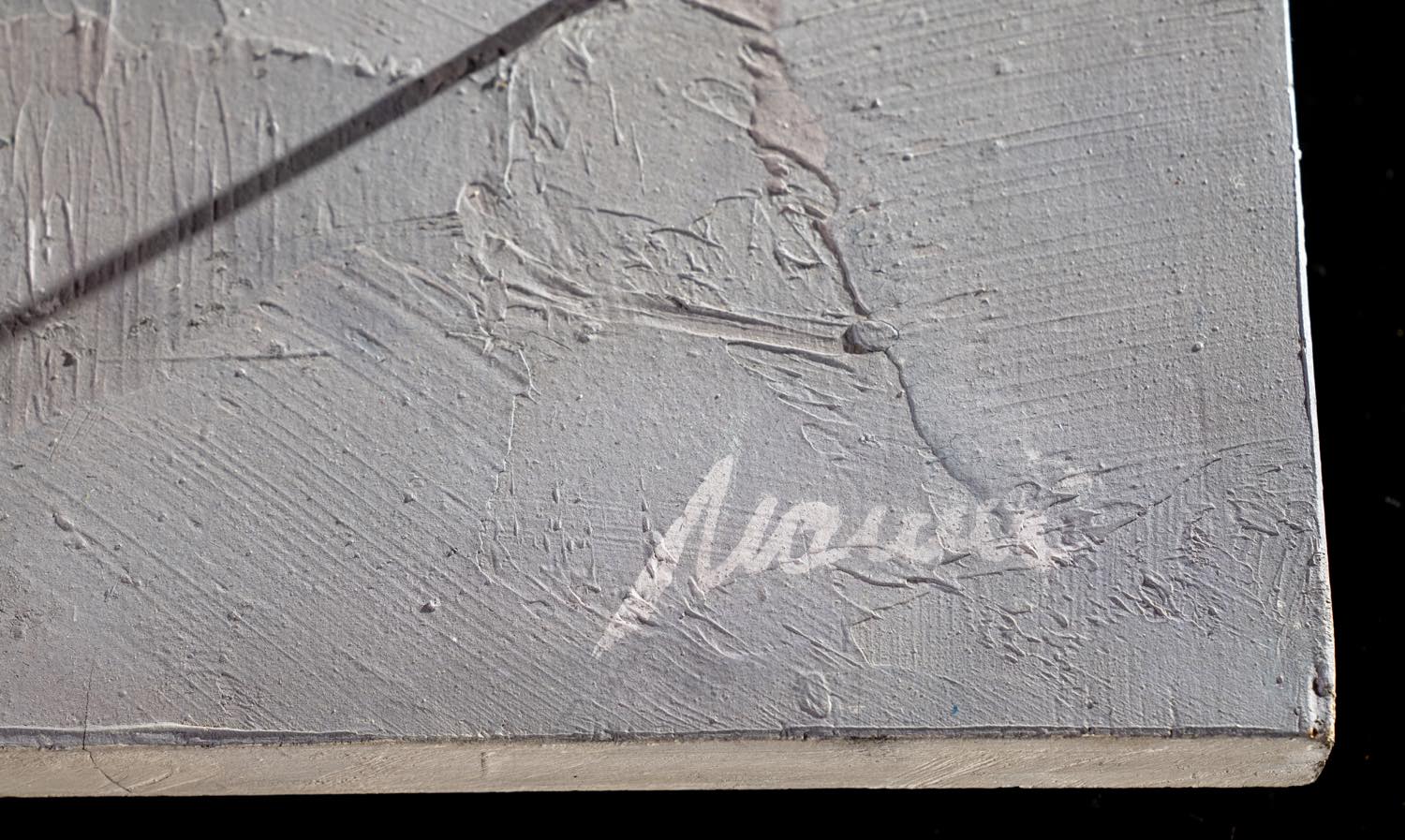 Scultura in legno dipinto e metallo, firmata alla base, H cm 80x94x25
