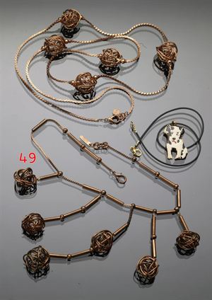 KRIZIA Collana girocollo in rame composta da elementi tubolari e pallini con cinque pendenti centrali, anni '80 Cm 48 1980's copper choker composed of 5 long dangling segments with spheres
