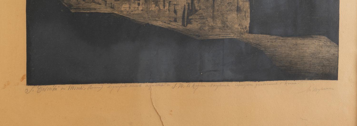 Acquaforte su carta, firmata in basso a destra, titolata in basso a sinistra, reca in basso al centro iscrizione, presenta al retro etichetta della Galleria Internazionale d’Arte Felsinea - Bologna, Lastra H cm 62x57.5 (difetti)