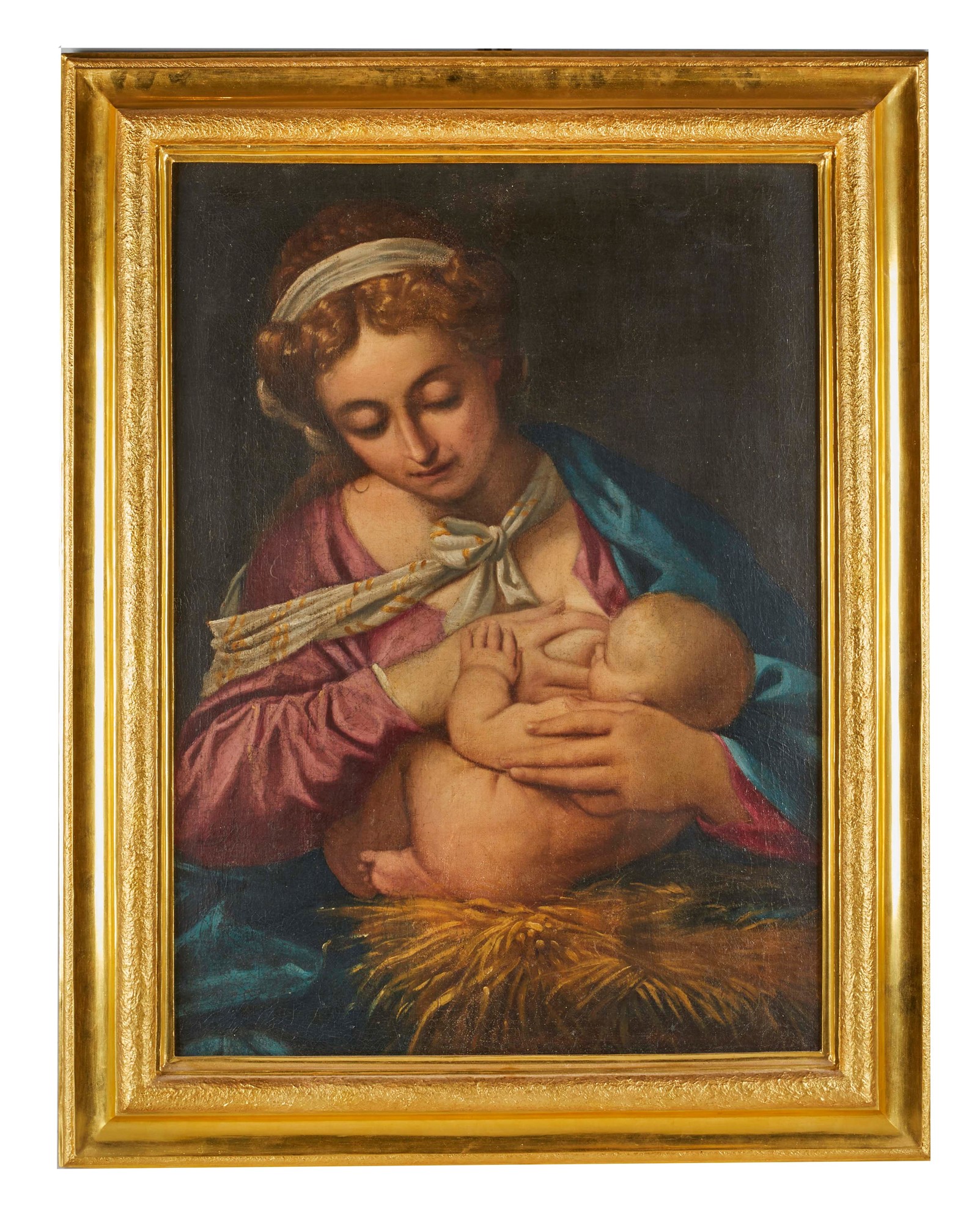Maestro emiliano degli inizi del XVII secolo, "Madonna con Bambino". Olio su tela. Cm 72x53. Al retro reca scritta Ludovico Carracci.