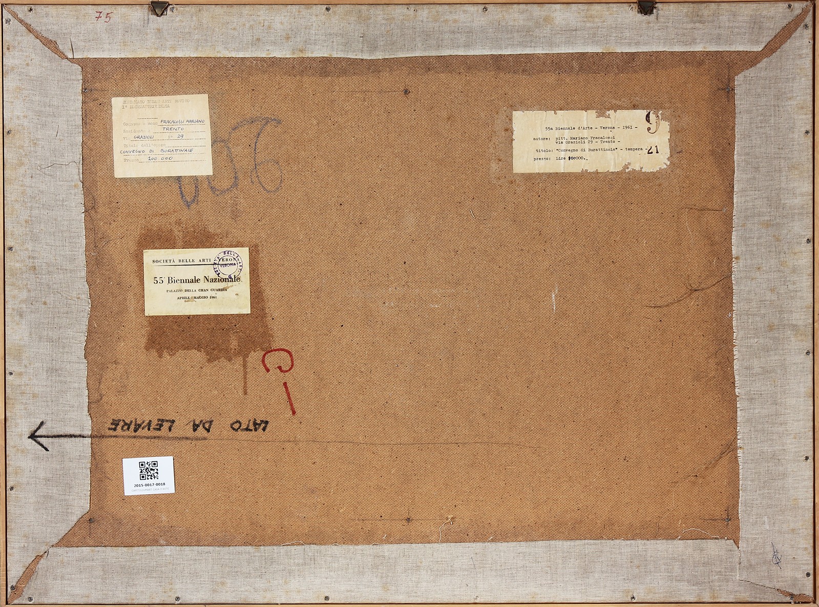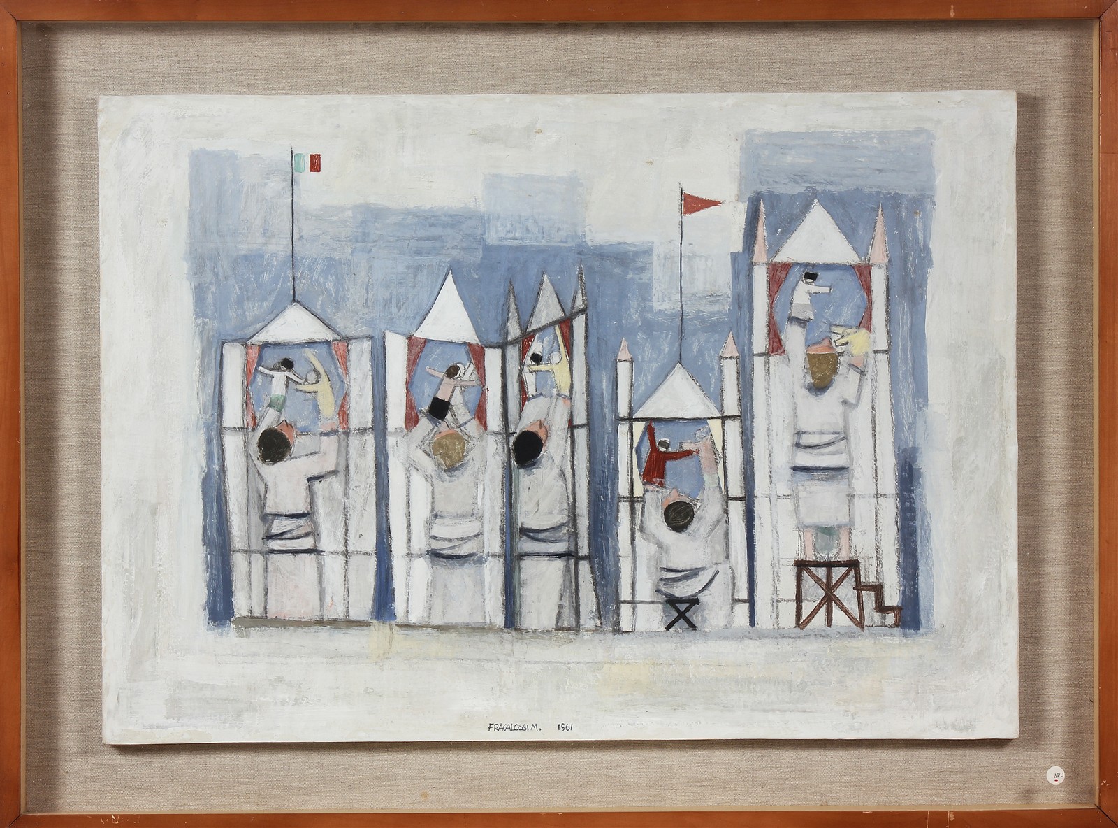 FRACALOSSI MARIANO (1923 - 2004) Convegno di Burattini. 1961. Olio su tavola. Cm 71,00 x 50,00. Firma e anno in basso al centro. Al retro cartiglio e timbro della 55° Biennale Nazionale presso Il Palazzo della Gran Guardia, Verona tenuta dall'Aprile al Maggio 1961. Cartiglio descrittivo a cura del Sindacato delle Arti, Rovigo. Cornice presente