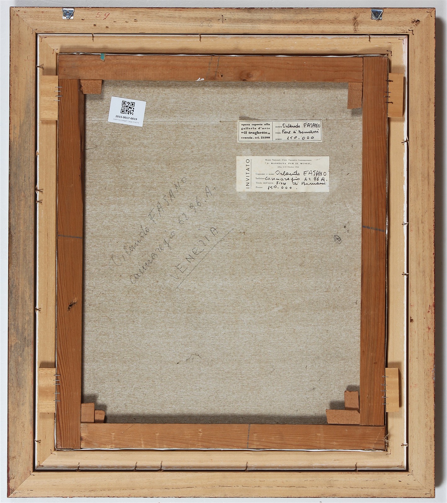 FASANO ORLANDO (1915 - 2001) Fiori di domani. Olio su tela . Cm 50,00 x 60,00. Al retro firma e cartiglio Galleria d'Arte il Traghetto, Venezia. Etichetta della mostra d'Arte Figurativa contemporanea, Alba da 4 al 18 Ottobre 1964.