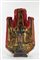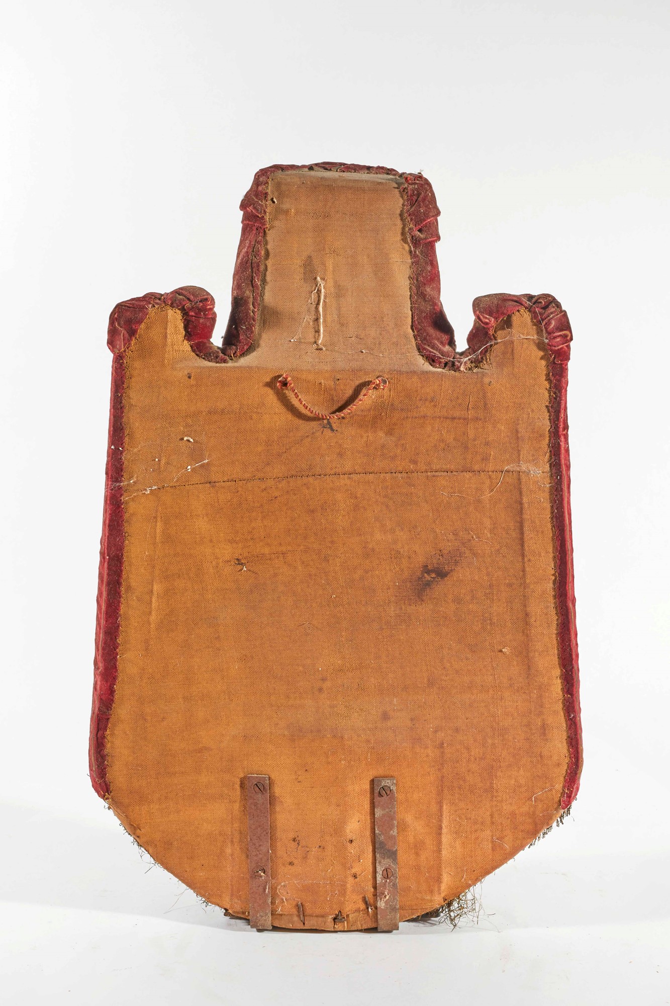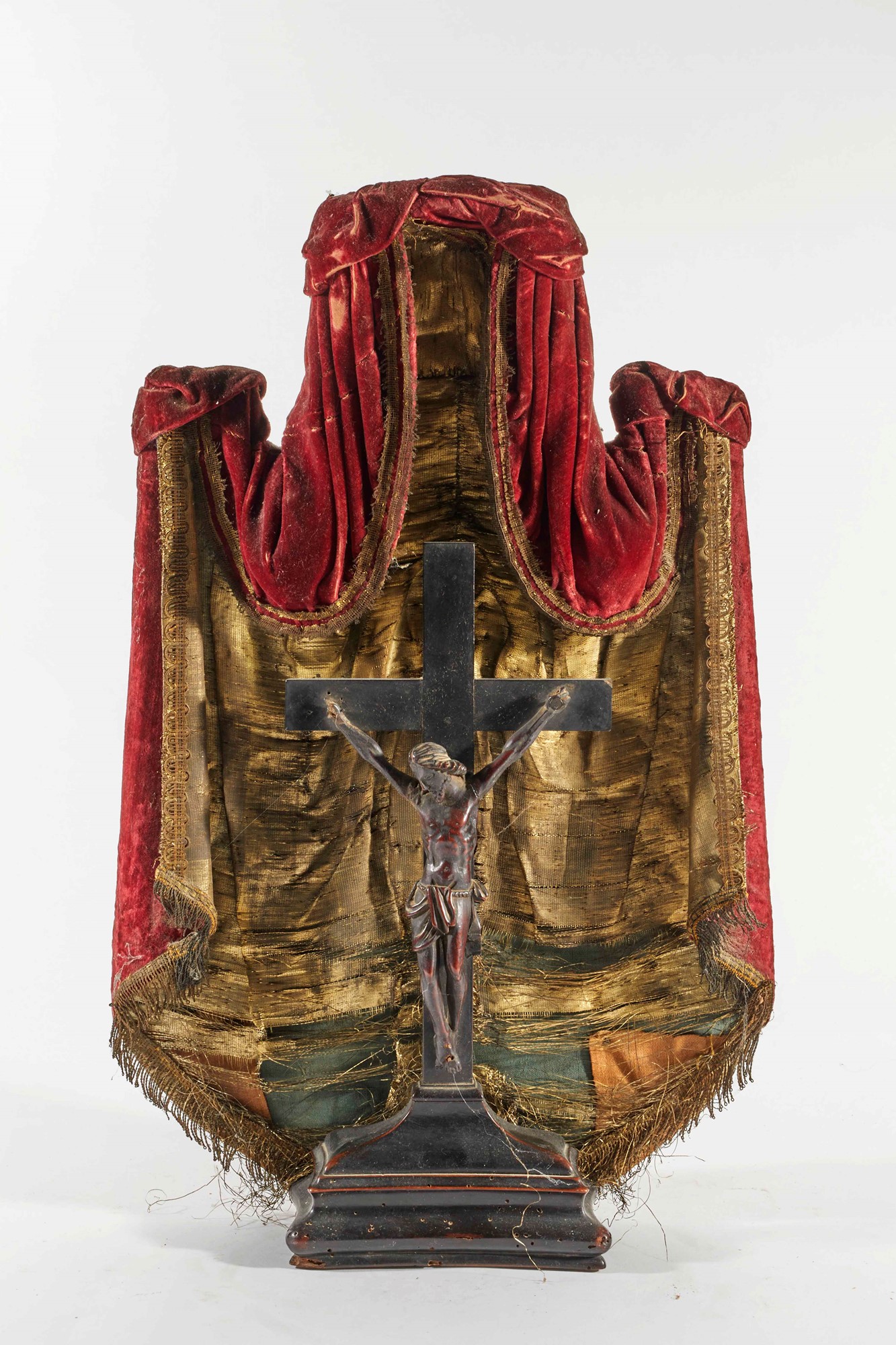"Corpus Cristi". Crocifisso in legno scolpito, con paramento sacro in broccato rosso e seta dorata. Fine del XVII secolo - inizi del XVIII secolo. Cm 53x32.