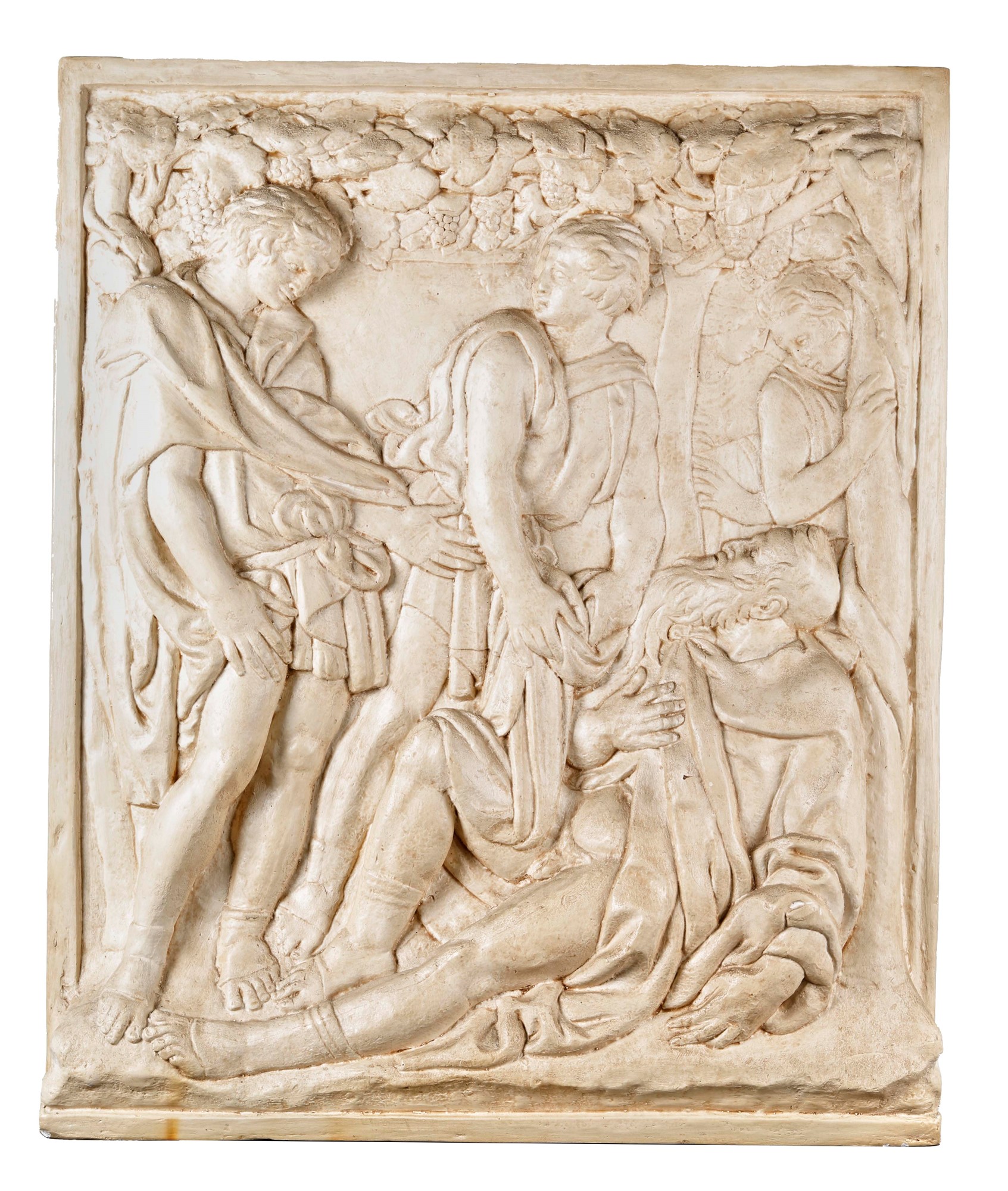 Calco in gesso raffigurante l'Ebrezza di Noè di Jacopo della Quercia (Porta Magna della Basilica di San Petronio, Bologna). XX secolo. Prod. Carpenter, Bologna. Cm 88x75x11. Al retro reca etichetta di produzione.