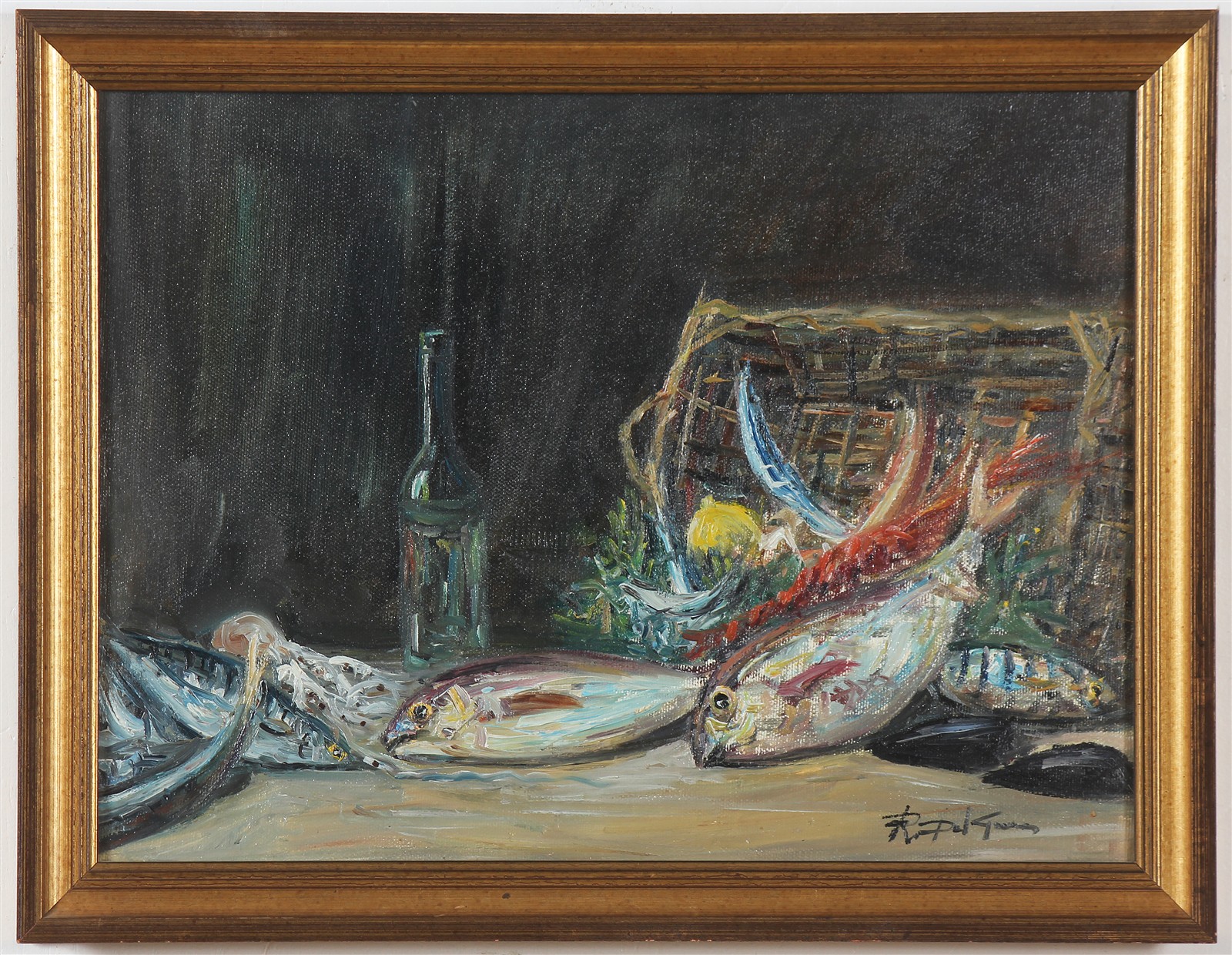 DEL GRECO RENZO Natura morta con pesce. 1968. Olio su tela . Cm 40,00 x 30,00. Firma in basso a destra. Al retro firma per autentica e data. Cornice presente