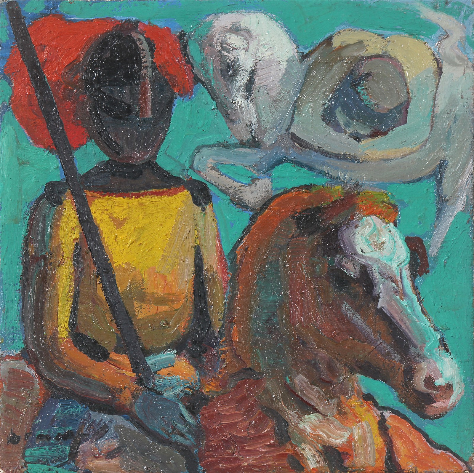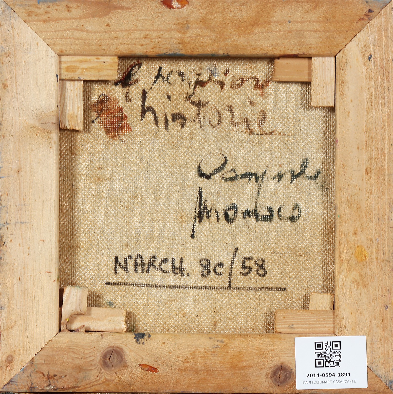MONACO PASQUALE (n. 1947) Historie. Olio su tela . Cm 30,00 x 30,00. Firma in basso a sinistra. Al retro firma, titolo e numero di archivio.
