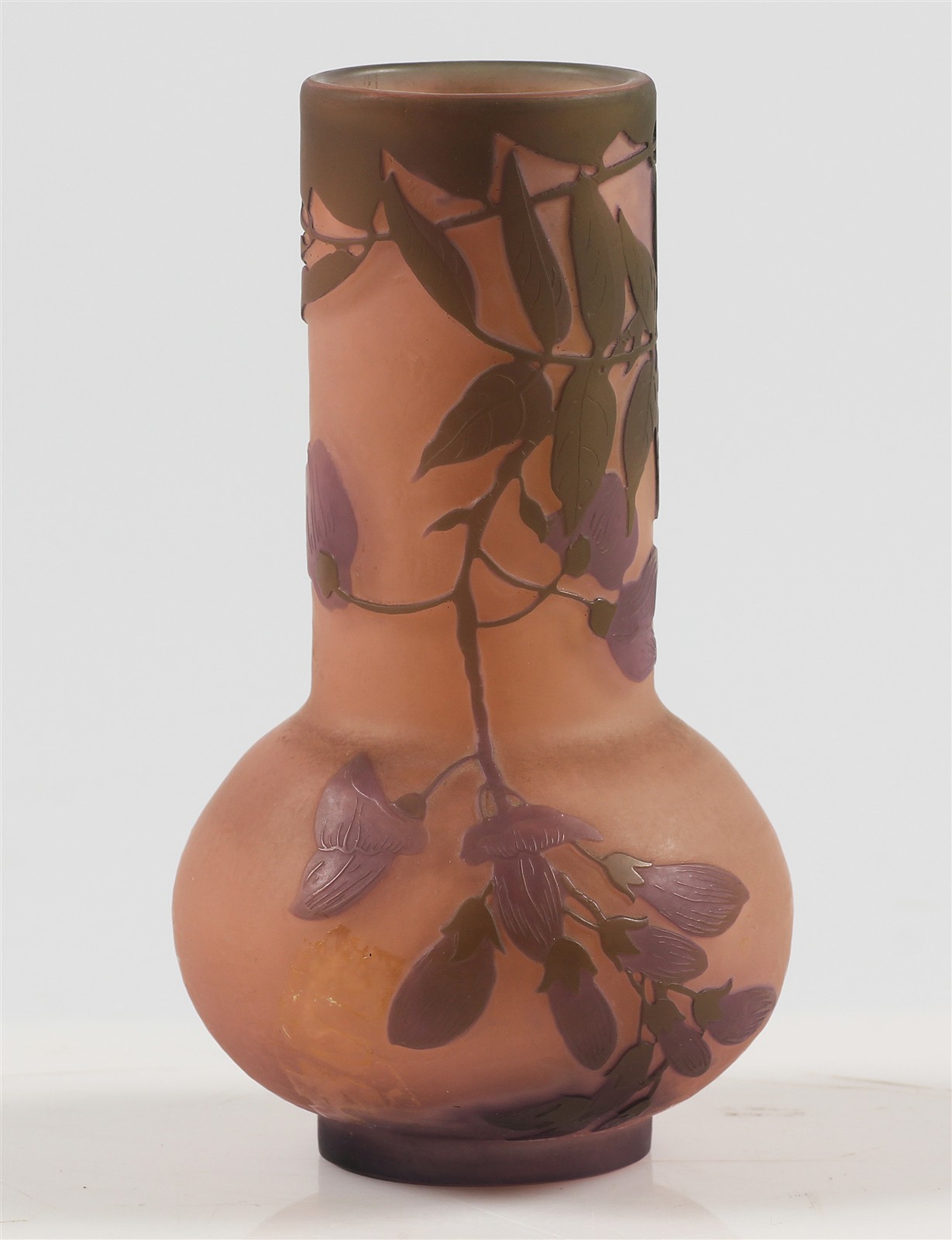 GALLE' EMILE (1846 - 1904) Vaso in vetro doppio cilindrico con base a bulbo. 1910. Vetro. Cm 15,00. Firma alla base in rilievo a cammeo. Decorodi buccioli floreali e foglie finemente inciso ad acido nei toni del viola su fondo rosato. Autentica su foto di Franco Borga.
