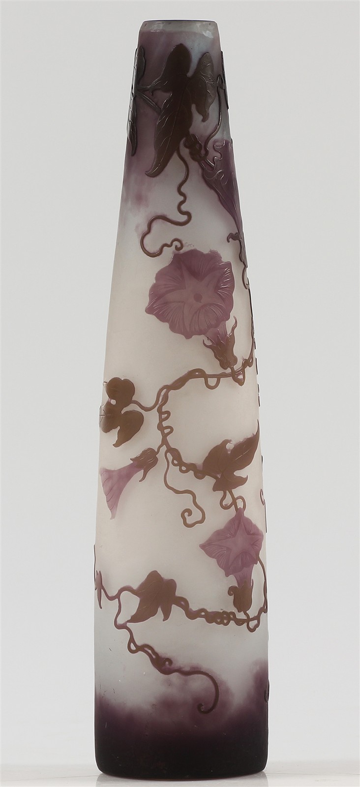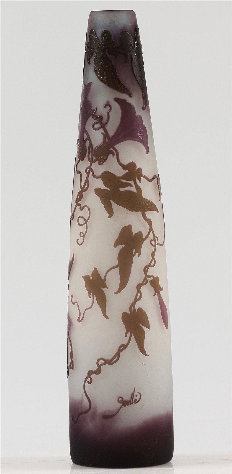 GALLE' EMILE (1846 - 1904) Vaso in vetro doppio troncoconico. Vetro. Cm 37,00. 1910 circa. Firma alla base in rilievo a cammeo. Decoro di campanule e foglie finemente inciso ad acido nei toni del viola su fondo neutro violaceo alle estremità. Autentica di Franco Borga su fotografia.