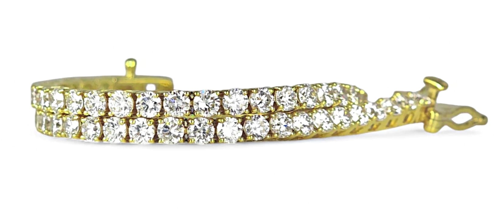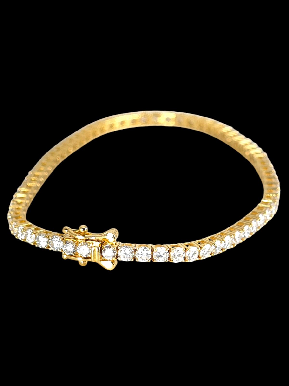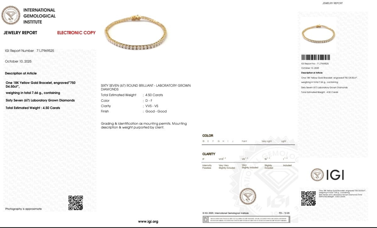 Bracciale tennis in oro giallo 18 carati con una montatura continua di sessantasette diamanti taglio brillante lab-grown. La chiusura è visibilmente marcata "750" per l'oro 18 carati e "D4,50ct" che indica il peso in carati dei diamanti. Il certificato di accompagnamento dell'International Gemological Institute (IGI), datato 10 ottobre 2025, conferma che il bracciale contiene sessantasette diamanti lab-grown con un peso totale stimato di 4,50 carati, classificati D-F in colore, VVS-VS in purezza e finitura Good-Good. Lunghezza: 18.5 cm Peso: 7,66 grammi