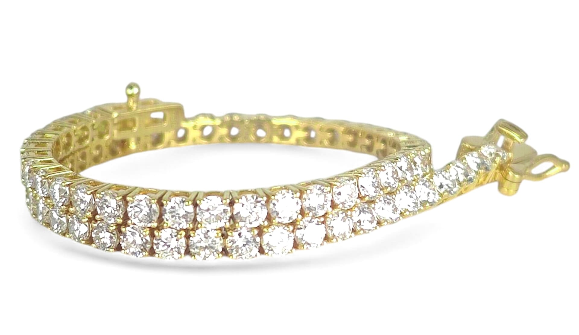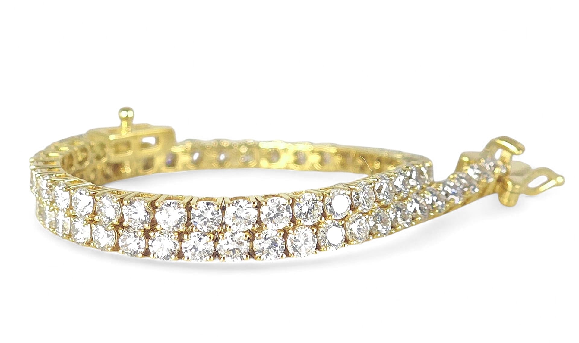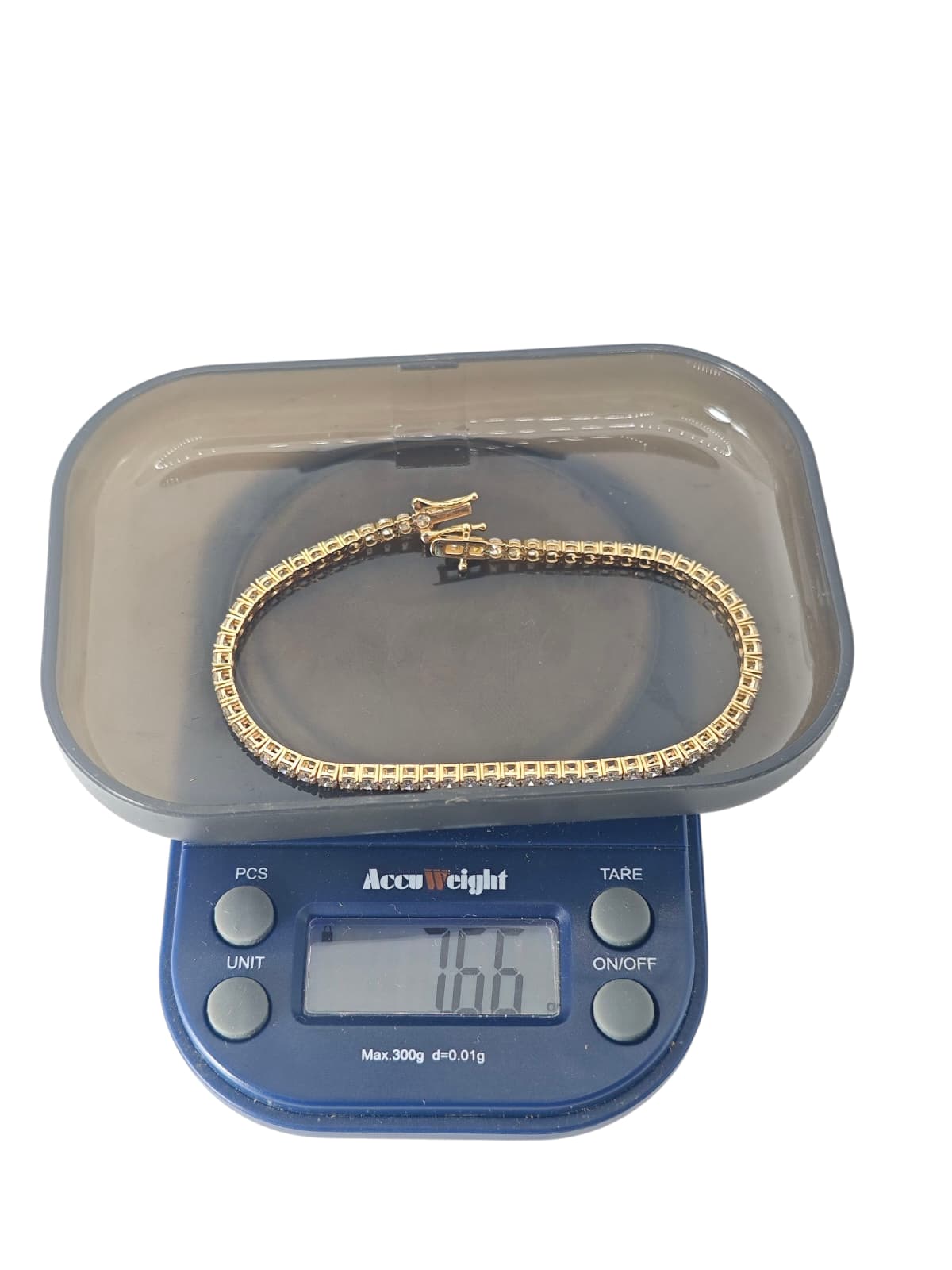 Bracciale tennis in oro giallo 18 carati con una montatura continua di sessantasette diamanti taglio brillante lab-grown. La chiusura è visibilmente marcata "750" per l'oro 18 carati e "D4,50ct" che indica il peso in carati dei diamanti. Il certificato di accompagnamento dell'International Gemological Institute (IGI), datato 10 ottobre 2025, conferma che il bracciale contiene sessantasette diamanti lab-grown con un peso totale stimato di 4,50 carati, classificati D-F in colore, VVS-VS in purezza e finitura Good-Good. Lunghezza: 18.5 cm Peso: 7,66 grammi