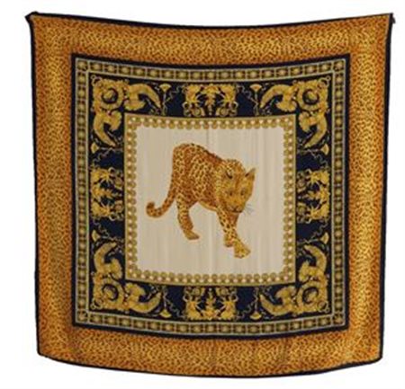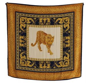 HERMES Foulard in seta con motivo centrale di leopardo su sfondo bianco, motivi ornamentali di cornucopie e ancelle su sfondo blu, bordo leopardato, anni '80 Cm 88x88 1980's blue, gold, white and beige with leopard motif in ceter surrounded by cornucopia and maidservantsand leopard border